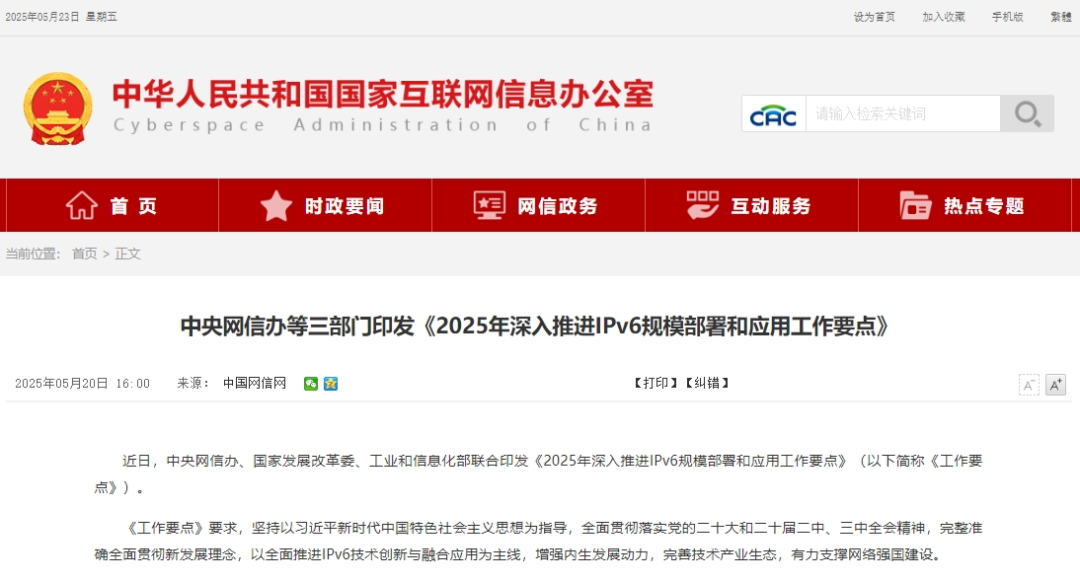 中央网信办等三部门印发《2025年深入推进IPv6规模部署和应用工作要点》