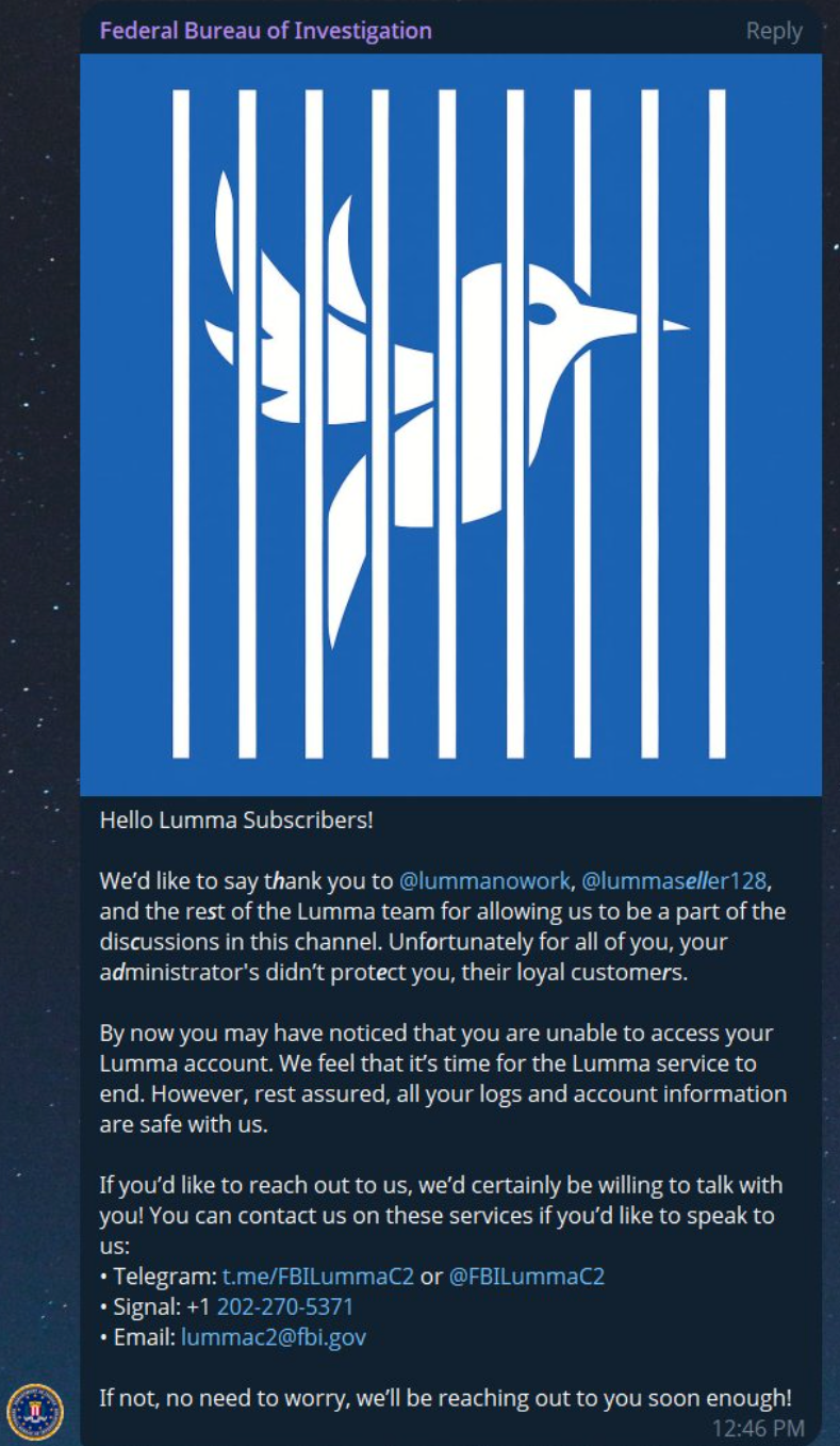 此次行动的参与方还包括ESET、CleanDNS、Bitsight、Lumen、GMO Registry和全球律师事务所Orrick。FBI和CISA也发布了联合公告,提供了与部署Lumma恶意软件的威胁行为者相关的妥协指标和已知战术、技术及程序的详细信息。