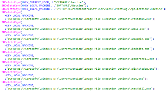 删除与反勒索工具Raccine相关的注册表项,以防止这些工具干预勒索软件的运行。Raccine是一个由Florian开源的反勒索软件,利用注册表项Image File Execution Options的监控机制,对勒索软件常用的系统程序进行监控,如 vssadmin.exe、bcdedit.exe、wmic.exe、powershell.exe 等。触发监控程序后,Raccine会寻找其可疑父进程进行终止。