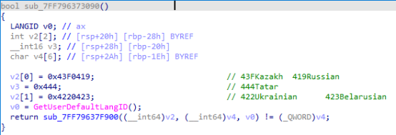 该恶意软件首先会调用GetUserDefaultLanguageID检查当前计算机的语言设置,并在特定语言环境(如俄语、哈萨克语、白俄罗斯语、乌克兰语和鞑靼语)下直接退出程序,从而避免加密这五种语言环境下的文件。