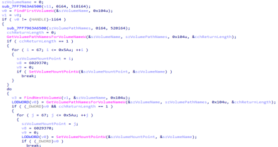 遍历系统中的所有卷,并提取每个卷的驱动器字母和挂载文件夹路径,以获取文件系统的结构,便于后续的文件操作。如果发现未挂载的卷,恶意软件会调用 SetVolumeMountPointW 函数将其挂载,以便访问和操作这些卷中的文件。