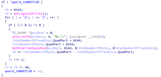 从A到Z遍历磁盘驱动器,根据位掩码筛选目标驱动器,计算已使用的存储空间。这一过程可能用于评估可加密的存储空间。