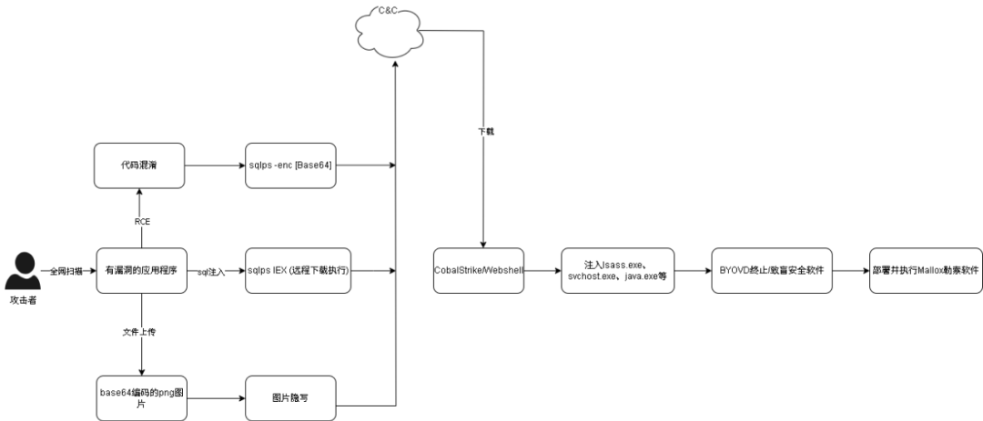 此外该勒索组织利用数十家企业的OA系统、财务管理系统及定制化平台中的SQL注入、文件上传漏洞、远程代码执行漏洞(RCE) 获取初始访问权限;随后通过反序列化、webshell等多种方式执行PowerShell命令,远程下载云端shellcode以实现对主机的控制。攻击者利用BYOVD技术强制结束安全软件进程,进一步入侵MS-SQL管理员账户(SA),并额外安装AnyDesk远程程序,以绕过安全措施并提升操作便捷性,最后实施最终勒索动作。目前暂未发现该攻击链中存在横向移动痕迹。