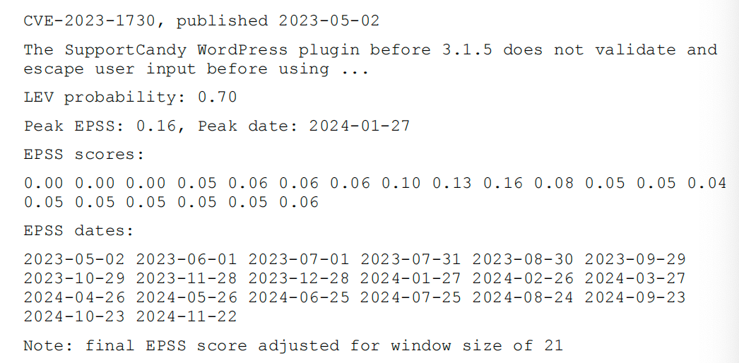 [4] Jacobs J, Romanosky S, Suciu O, Edwards B, Sarabi A (2023) Enhancing Vulnerability prioritization: Data-driven exploit predictions with community-driven insights. 2023 IEEE European Symposium on Security and Privacy Workshops (EuroS&PW) (IEEE Computer Society, Delft, The Netherlands), pp 194-206.https://doi.ieeecomputersociety.org/10.1109/EuroSPW59978.2023.00027