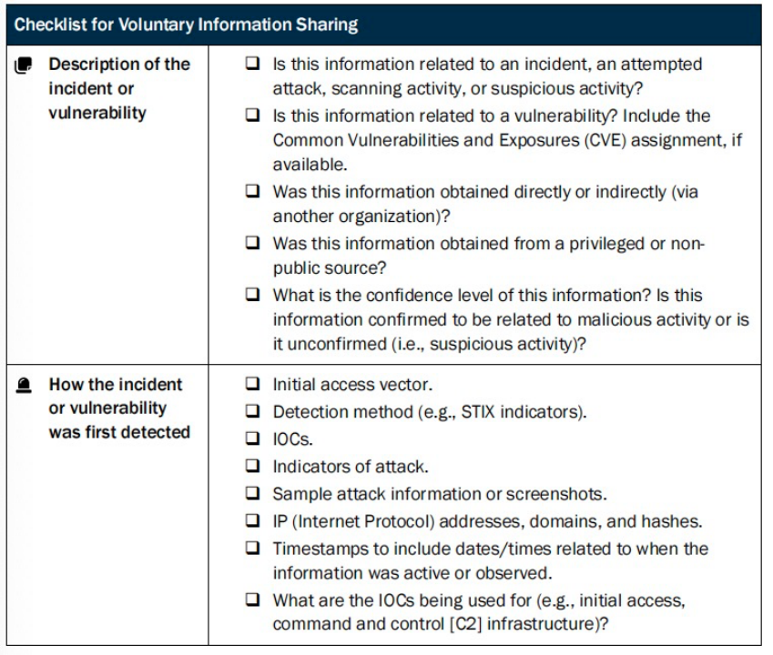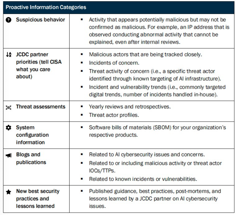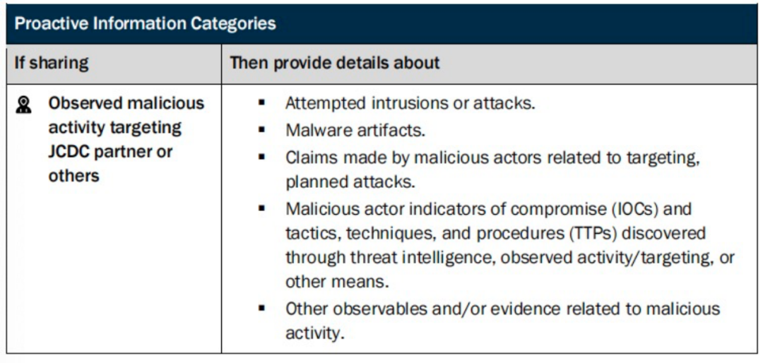 表 1 所列的主动信息共享类别有助于 CISA 和 JCDC 合作伙伴评估已观察到的相关信息,了解行动环境的复杂性,并就潜在的防御行动做出明智决策。另请参阅附录 B,了解鼓励合作伙伴主动共享信息的事件示例。