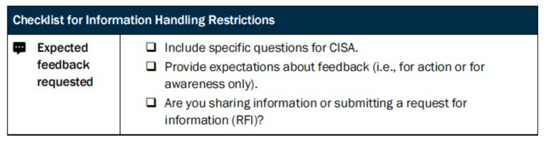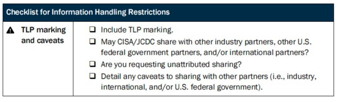有时,JCDC 合作伙伴可能希望在不注明出处的情况下共享信息。在这种情况下,这些合作伙伴可直接与 CISA 共享,由 CISA 在不注明出处的情况下继续共享。合作伙伴在与 CISA 共享信息时,应提供有关如何处理其信息的详细说明,并指定信息使用的任何限制(如清单 1 所述)。 有了这些保障措施和协议,CISA 可在 JCDC 内部营造一个共享关键网络安全信息的安全环境,鼓励积极参与并保护敏感数据。附录 A 提供了表 1 的填充示例。
