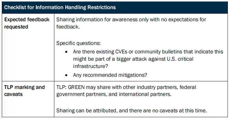 CISA 利用交通灯协议 (TLP) 作为其主要的传播控制标记系统。JCDC 内部通过电子邮件共享的所有数据均应明确标注相关的 TLP 名称。同样,其他利益相关者也可通过电子邮件与 JCDC 共享信息,[email protected],并遵循 TLP 标记系统。某些 TLP 标记要求在向组织外传播前获得信息来源的许可。所有组织都应在分享前寻求适当的许可。下文 “主动信息共享 ”和 “关于事件或漏洞的信息共享 ”部分提供了有关与 JCDC 共享的有价值信息类型的更多指导。