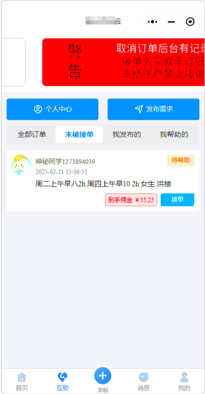 小程序存在跑腿赚钱功能,用可以接单的骑手号去接一个没有被接单的订单, 记录接单的请求