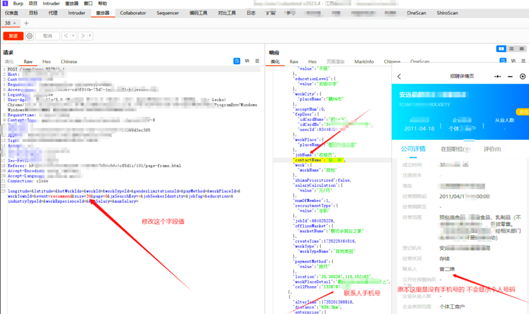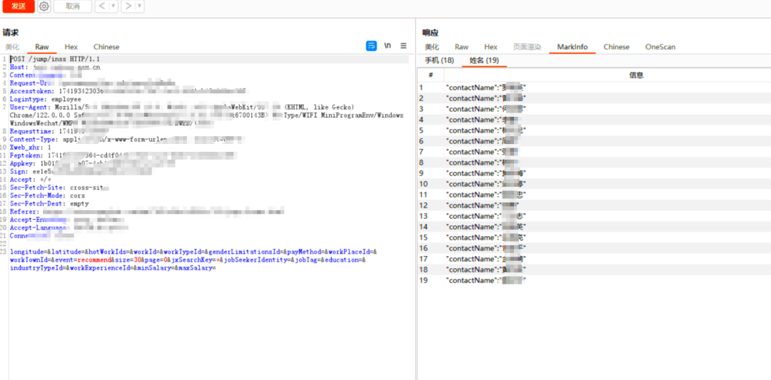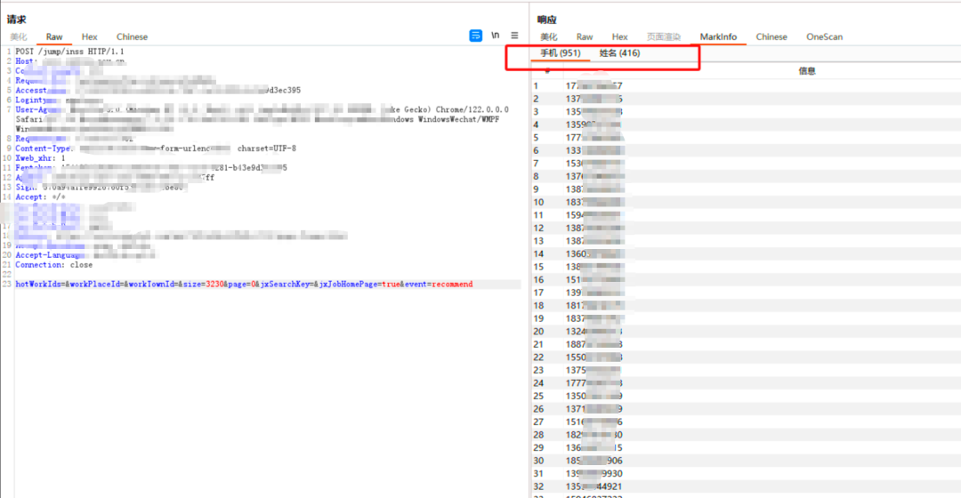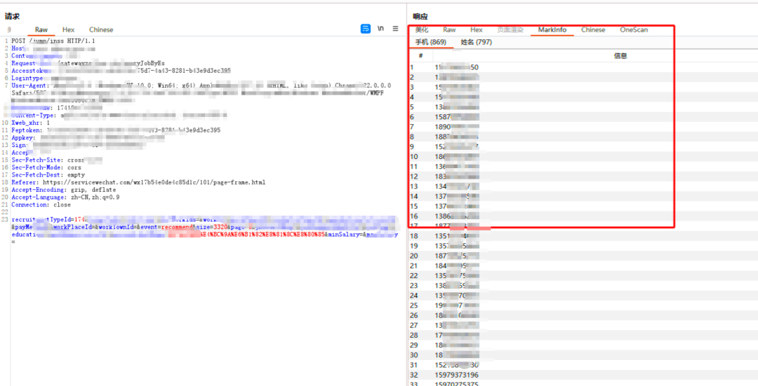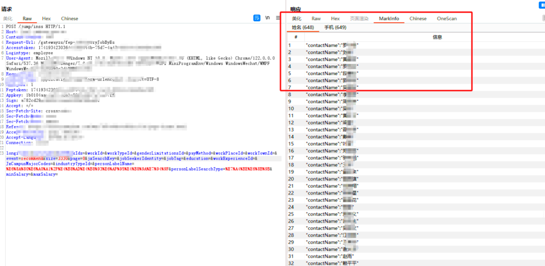 其他功能点均存在此问题,大部分都是页面只能看到企业联系人姓名,打电话联系也是虚拟号码,但是在响应体中确会显示所有的手机号码和姓名,小程序业务也是求职里面包含大量的公司企业,通过响应包缺陷+模糊查询*+size字节+Hae神器匹配整站企业联系人二要素全部泄露,并未全部列出但目测2w+条