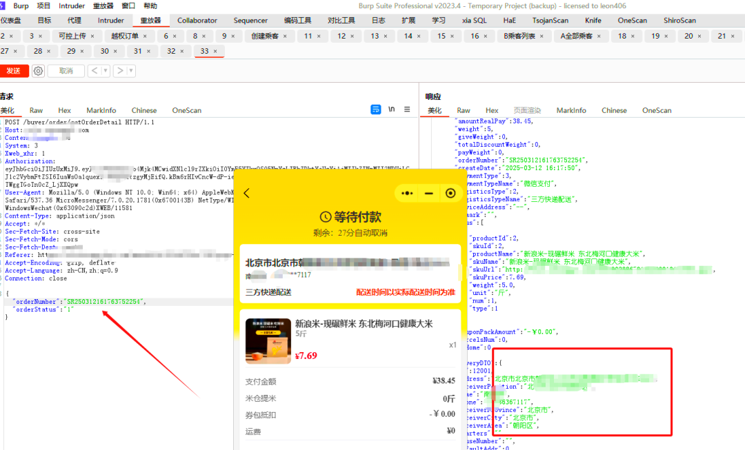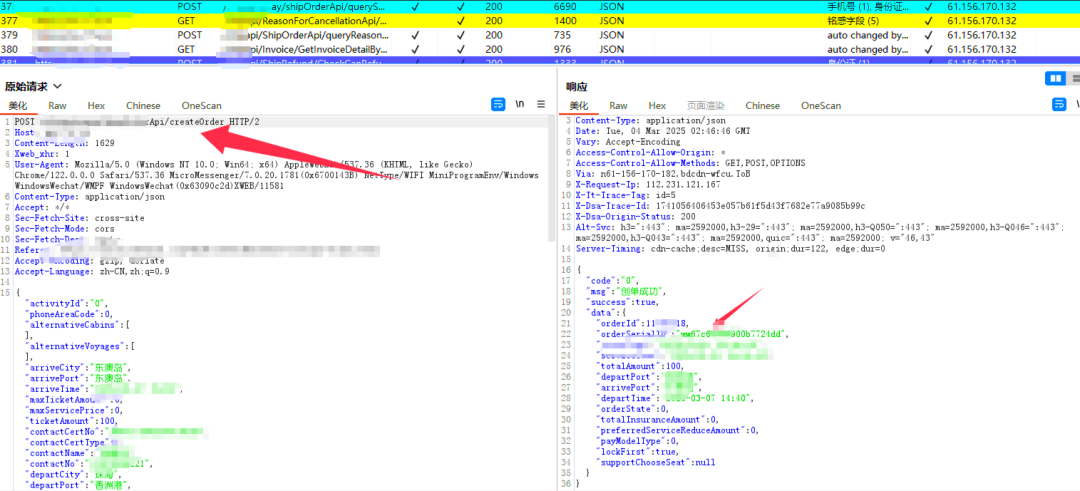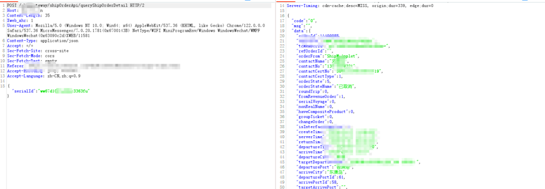 这两个字段都是鉴权字段,有了此字段的就可以跟替换Cookie一样替换别人的身份其他人的,操作此小程序所有增删改查功能点,当前虽然开着Hae但并没有相关的规则字段正则所以匹配不到,真的是细心才能发现,如果这个订单接口可以继续利用遍历的话,再结合返回的这两个字段,整个小程序用户信息全部会被接管,所有乘客三要素包括小程序所有功能点