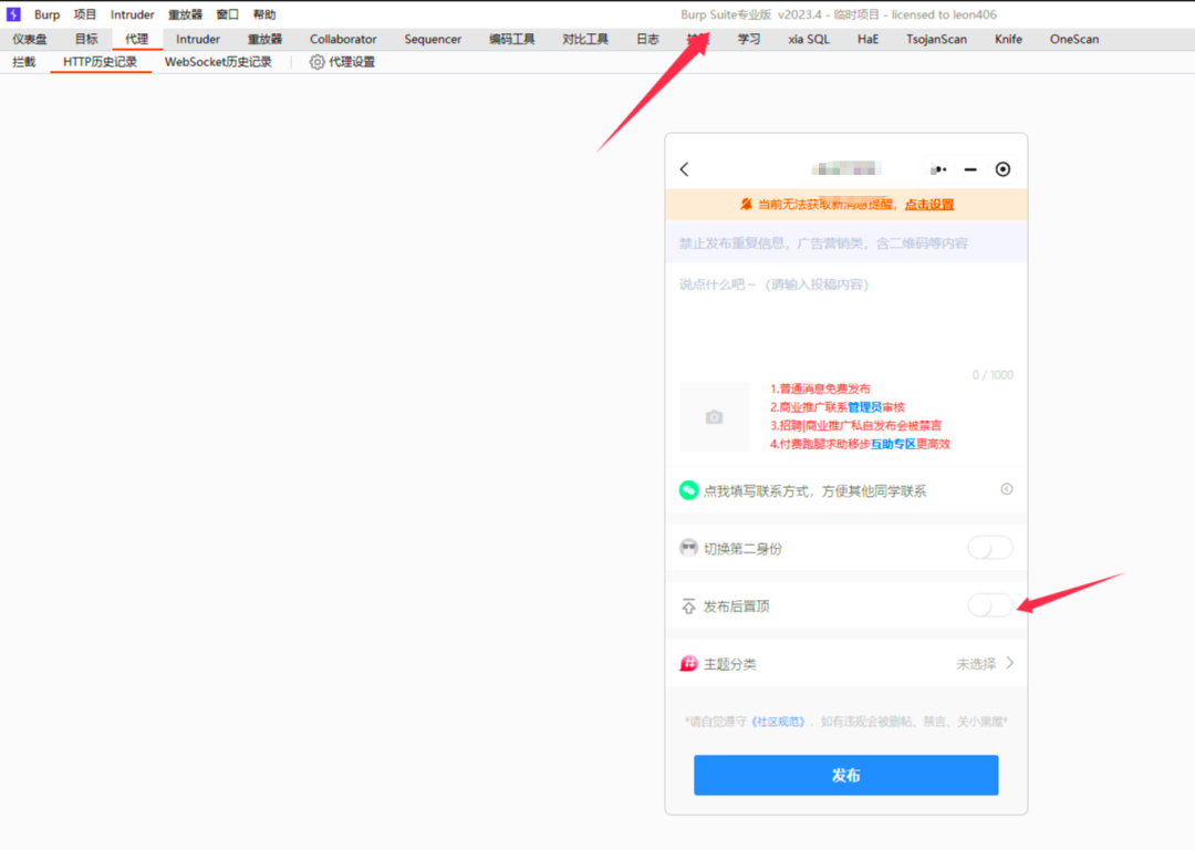 BURP渗透抓包工具抓取小程序的数据包 在主页点击发帖功能 ,下面有一个功能是花钱对帖子置顶