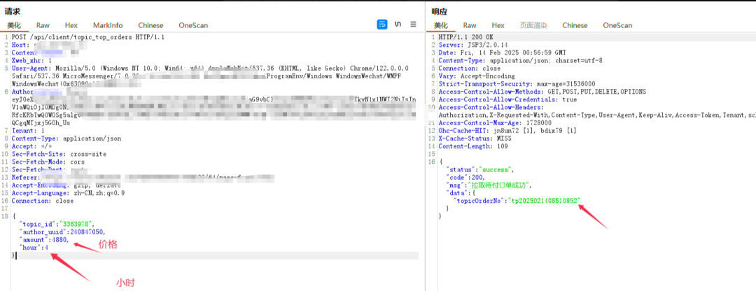 /api/client/topics 帖子内容文字和标签/api/client/topic_top_orders 置顶的价格生成订单号 这里进行篡改payment/wechat/preorder/topictop/tp2025021408581339 请求后端付款