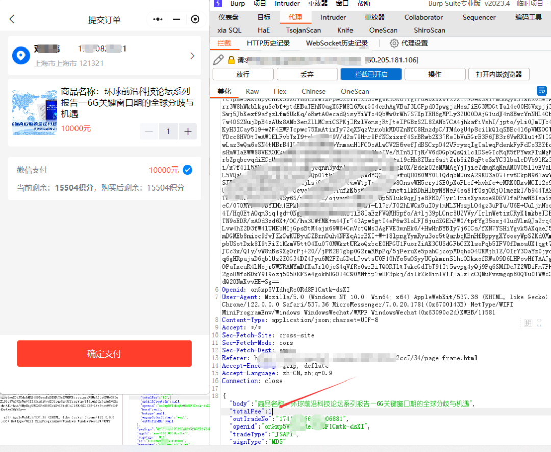 知晓了业务流程后续就是BP抓取生成订单的数据包 api/client/topic_top_orders 进行拦截篡改操作 价格改小就可以完成0元购,点击付费 就会拦截数据包修改价格然后一直放行就行了出现付款的选择 选择二维码支付 扫描付款就行了