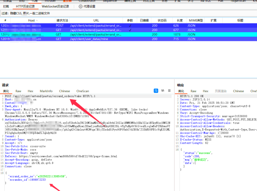 操作这个接口,替换订单号为任意的,跑腿者身份为别人的,可以任意指定谁去接谁的单,经过测试替换别人身份是可行的,订单号以及跑腿者的身份利用其他功能点的输出就可以得到