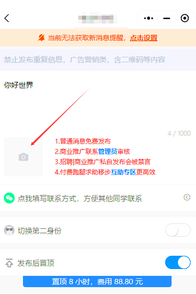 随意输入帖子的文案 然后点击发布后置顶[/api/client/topics/pay_configs] 接口显示出了对应的价格字段还有所持续的时间