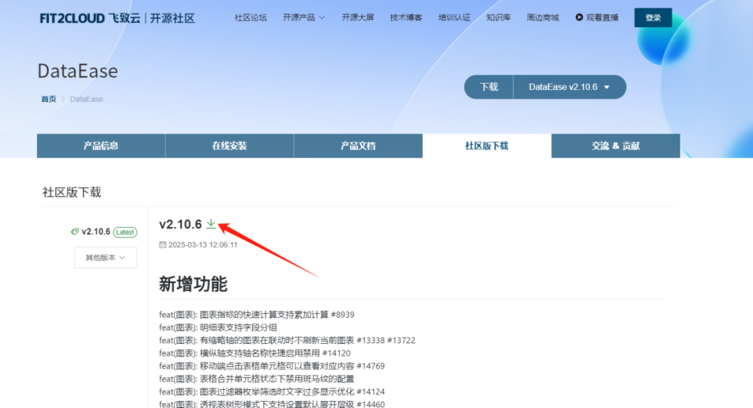 以社区版为例,到官网下载当前最新的版本2.10.6的安装包(https://community.fit2cloud.com/#/products/dataease/downloads),下载之后的文件为dataease-offline-installer-v2.10.6-ce.tar.gz,将其放置到待修复的环境中。