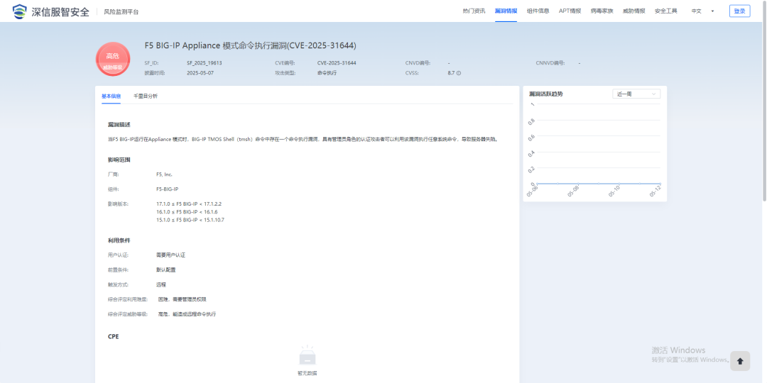 2025年5月13日,深瞳漏洞实验室监测到一则F5-BIG-IP组件存在命令执行漏洞的信息,漏洞编号:CVE-2025-31644,漏洞威胁等级:高危。