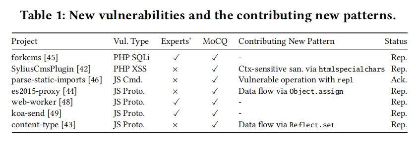 在包含73个真实漏洞的测试集中,MoCQ能够成功检测出其中的56个,达到了77%的召回率,同时保持了合理的误报率(精准率约40%)。更值得注意的是,MoCQ不仅在已有漏洞检测中表现优异,还在19个最新版本的开源项目中发现了7个此前未知的新漏洞,其中包括SQL注入、跨站脚本攻击(XSS)以及原型污染等严重安全问题。这些新发现进一步验证了MoCQ在实际应用中发现”零日漏洞”的潜力。