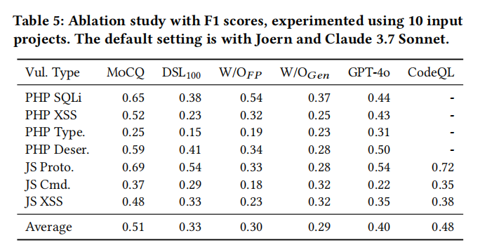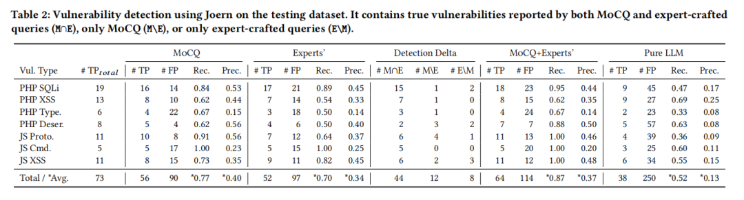 为了全面验证MoCQ框架的有效性,作者在实际项目中进行了大量实验。研究团队选取了涵盖PHP和JavaScript两种编程语言的七种常见漏洞类型,分别在多个真实开源项目中进行了测试。通过对比,MoCQ自动生成的检测查询在准确性和实用性上表现出了极强的竞争力。
