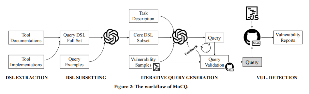 MoCQ的工作流程包括两个关键创新点。首先,系统会从现有静态分析工具(如Joern或CodeQL)的文档和源码中,自动提取并构建精简版DSL(领域特定语言)子集。这一精简子集极大降低了LLM生成语法错误或无效查询的风险,同时仍然保留了足够表达复杂漏洞模式的能力。