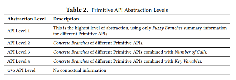 接着,在原语API抽象阶段,通过控制流和数据流分析,提取调用链中涉及资源管理的关键API操作(如malloc、free、open、close等)。依据调用的出现频率、控制分支条件及关键变量信息,按照不同粒度(A1到A4层次)进行抽象,既保留足够上下文信息,又有效抑制噪声。