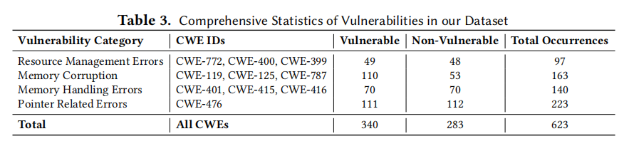 实验采用了真实世界的C/C++漏洞数据集——NVD-New,该数据集源自16个开源项目,包含大量与内存安全相关的漏洞。通过筛选符合研究目标的样本,共获得623个样本,其中包含340个漏洞样本和283个非漏洞样本,涵盖资源泄露、越界访问、空指针引用等多种漏洞类型。