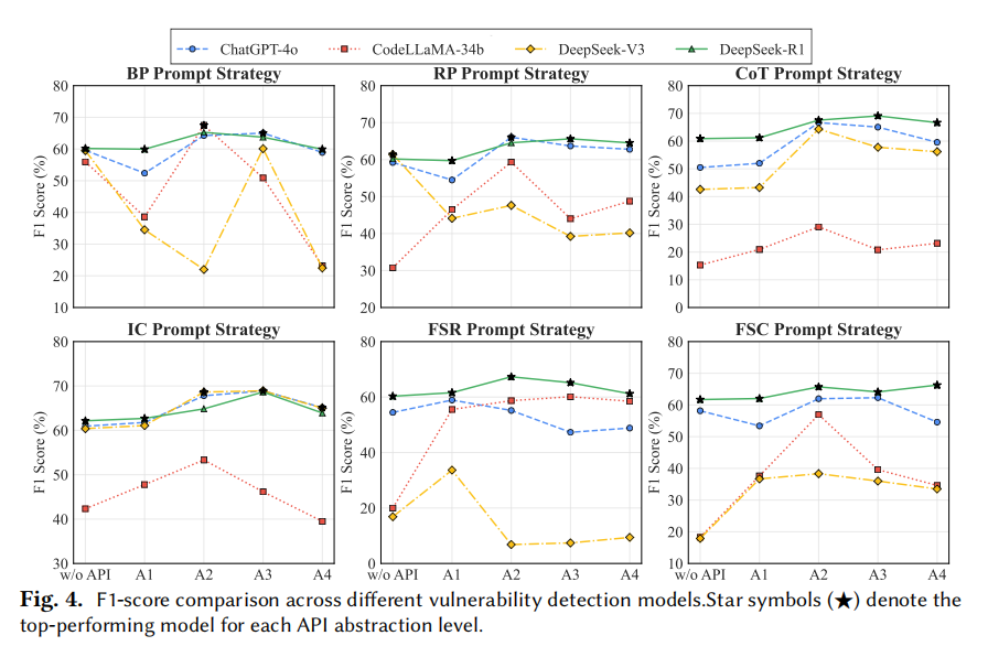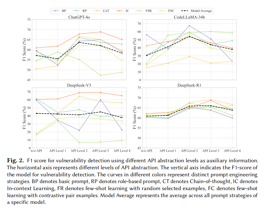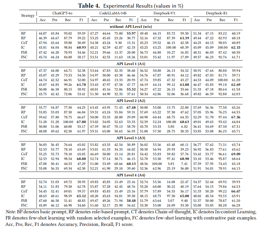 模型和Prompt策略也对最终效果有重要影响。DeepSeek-R1综合表现最好,在API Level 3结合链式思考(CoT)策略时,F1分数最高达69.09%。此外,链式思考(CoT)和上下文学习(ICL)策略在中高抽象层次下特别有效,显著增强了模型的推理能力。