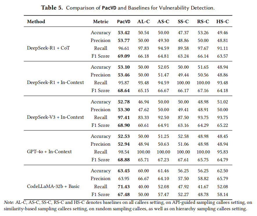 与传统基线方法相比,PacVD在准确率、精确率和召回率等指标上均实现了大幅超越,验证了结合原语API抽象和Prompt优化能够切实提升大型语言模型的漏洞检测能力。
