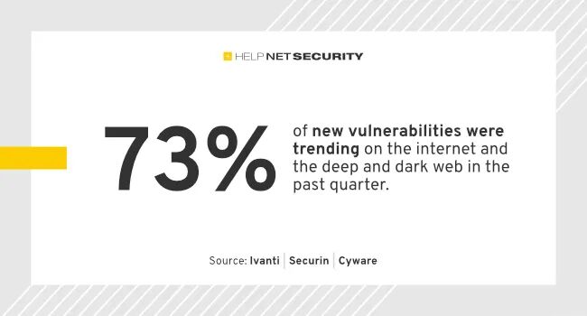 在过去的一个季度中,73% 的这些漏洞在互联网和深网和暗网中呈上升趋势。
