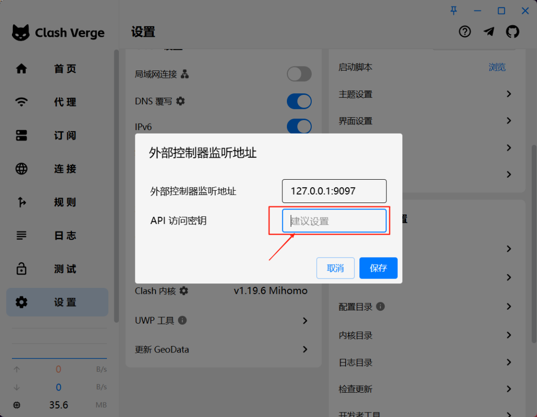 1、打开 Clash Verge 点击设置、Clash 设置、外部控制、添加密码验证。