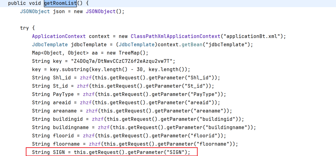 这里直接定位到了一处对应的配置文件,知道了路径,并且这里没有拦截器之类的进行鉴权,直接可以前台访问,跟入寻找YktJrhx这个类,并且我们查看方法getRoomList方法。