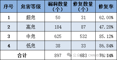 本周共发布超危漏洞50个,高危漏洞184个,中危漏洞625个,低危漏洞38个。相应修复率分别为62.00%、47.28%、85.12%和86.84%。根据补丁信息统计,合计683个漏洞已有修复补丁发布,整体修复率为76.14%。详细情况如表3所示。