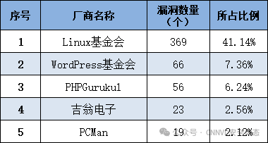 从厂商分布来看,Linux基金会新增漏洞最多,有369个。各厂商漏洞数量分布如表1所示。