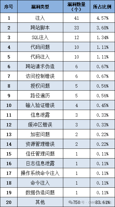根据国家信息安全漏洞库(CNNVD)统计,本周新增安全漏洞897个,漏洞新增数量有所上升。从厂商分布来看Linux基金会新增漏洞最多,有369个;从漏洞类型来看,注入类的安全漏洞占比最大,达到4.57%。新增漏洞中,超危漏洞50个,高危漏洞184个,中危漏洞625个,低危漏洞38个。