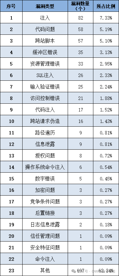 从漏洞类型来看,注入类的安全漏洞占比最大,达到7.33%。漏洞类型统计如表2所示。