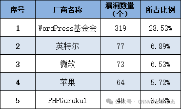 从厂商分布来看,WordPress基金会新增漏洞最多,有319个。各厂商漏洞数量分布如表1所示。