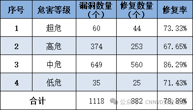 本周共发布超危漏洞60个,高危漏洞374个,中危漏洞649个,低危漏洞35个。相应修复率分别为73.33%、67.65%、86.29%和71.43%。根据补丁信息统计,合计882个漏洞已有修复补丁发布,整体修复率为78.89%。详细情况如表3所示。