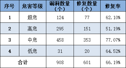 本周共发布超危漏洞124个,高危漏洞295个,中危漏洞458个,低危漏洞31个。相应修复率分别为62.10%、51.19%、77.07%和64.52%。根据补丁信息统计,合计601个漏洞已有修复补丁发布,整体修复率为66.19%。详细情况如表3所示。