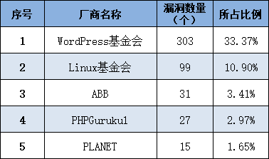 从厂商分布来看,WordPress基金会新增漏洞最多,有303个。各厂商漏洞数量分布如表1所示。