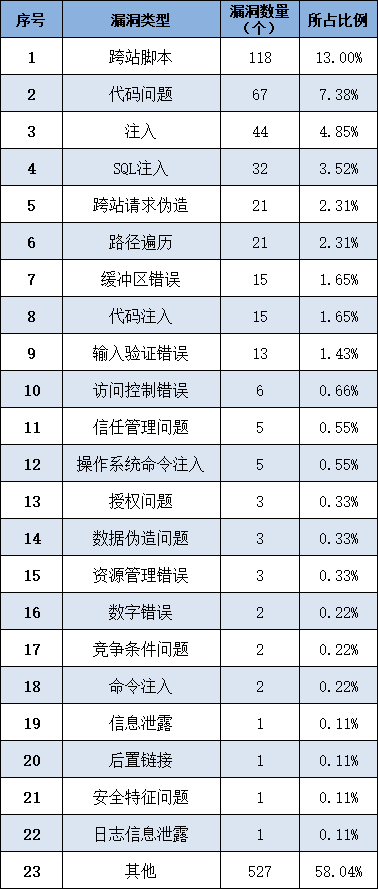 从漏洞类型来看,跨站脚本类的安全漏洞占比最大,达到13.00%。漏洞类型统计如表2所示。