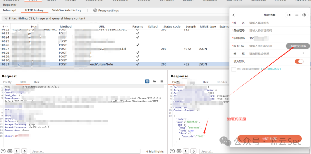 这里先输入正确的手机号,然后获取验证码。获取到正确验证码再进行发送请求