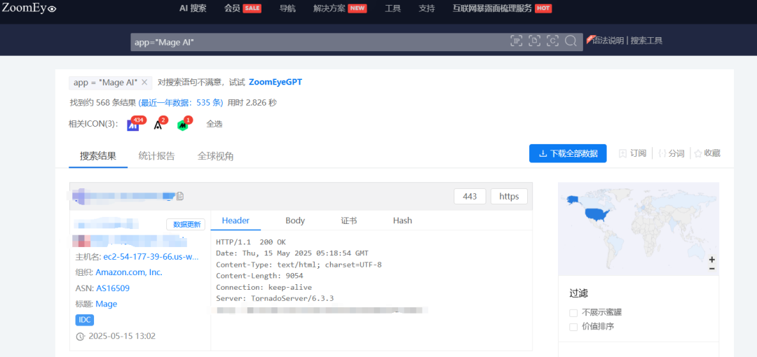 根据ZoomEye网络空间搜索引擎关键字 app=”Mage AI” 对潜在可能目标进行搜索,共得到568条IP历史记录。主要分布在美国、德国等国家。