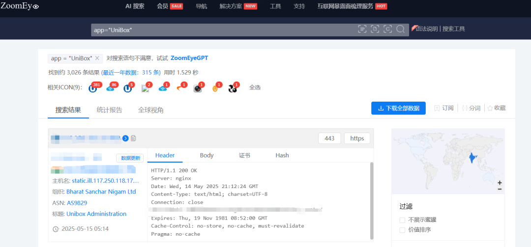 根据ZoomEye网络空间搜索引擎关键字 app=”UniBox” 对潜在可能目标进行搜索,共得到3026条IP历史记录。主要分布在印度、澳大利亚等国家。