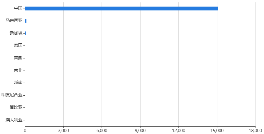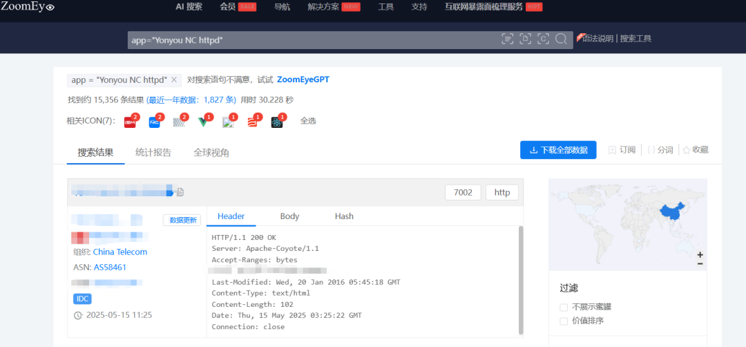 根据ZoomEye网络空间搜索引擎关键字 app=”Yonyou NC httpd” 对潜在可能目标进行搜索,共得到15356条IP历史记录。主要分布在中国、马来西亚等国家。