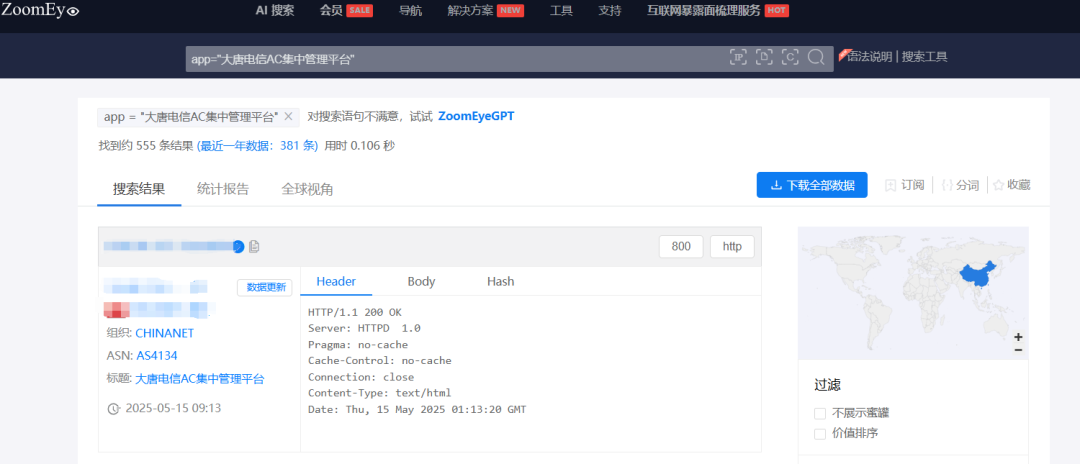 根据ZoomEye网络空间搜索引擎关键字 app=”大唐电信AC集中管理平台” 对潜在可能目标进行搜索,共得到555条IP历史记录。主要分布在中国四川、重庆等地。