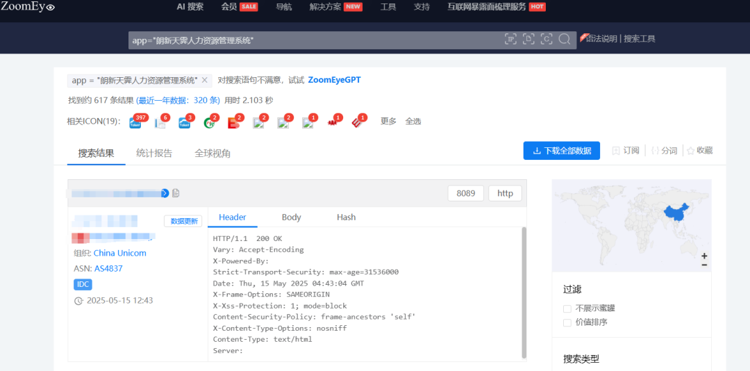 根据ZoomEye网络空间搜索引擎关键字 app=”朗新天霁人力资源管理系统” 对潜在可能目标进行搜索,共得到617条IP历史记录。主要分布在中国福建、北京等地。