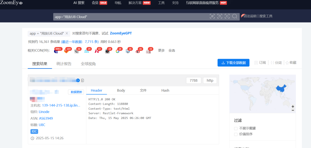 根据ZoomEye网络空间搜索引擎关键字 app=”用友U8 Cloud” 对潜在可能目标进行搜索,共得到16361条IP历史记录。主要分布在中国、美国等国家。