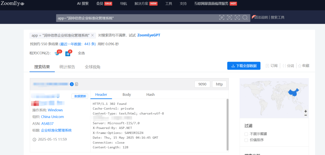 根据ZoomEye网络空间搜索引擎关键字 app=”润申信息企业标准化管理系统” 对潜在可能目标进行搜索,共得到550条IP历史记录。主要分布在中国北京、上海等地。