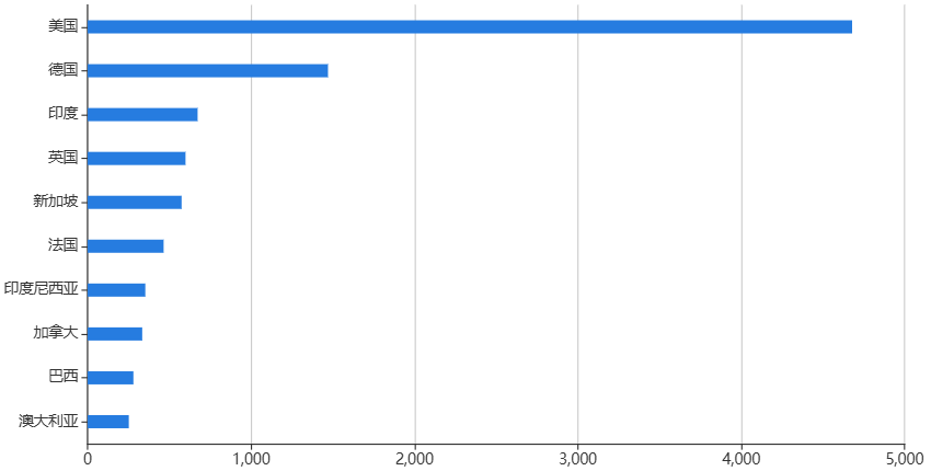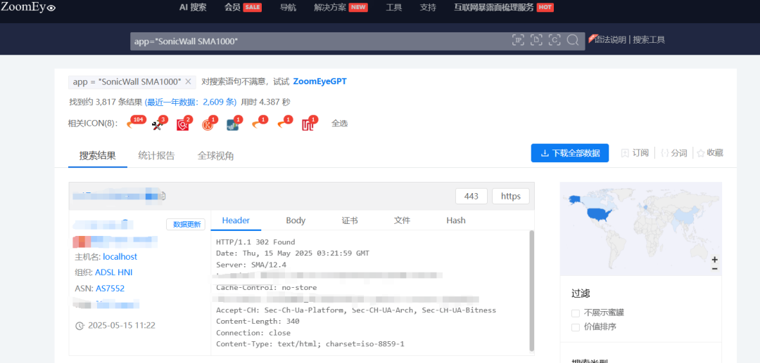根据ZoomEye网络空间搜索引擎关键字 app=”SonicWall SMA1000″ 对潜在可能目标进行搜索,共得到3817条IP历史记录。主要分布在美国、德国等国家。